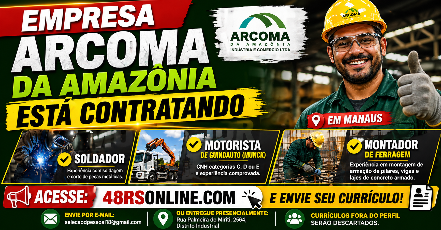 Uma nova oportunidade de emprego em Manaus acaba de surgir e pode ser o passo que faltava para quem busca uma vaga com carteira assinada. A empresa Arcoma da Amazônia Indústria e Comércio Ltda está com vagas abertas em Manaus para três funções: soldador, motorista de guindauto e montador de ferragem.