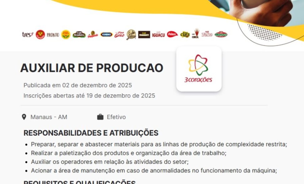 Vaga aberta para Auxiliar de Produção I na fábrica 3corações. Saiba como funciona o trabalho, quais são os requisitos, como enviar currículo e dicas importantes para conquistar sua vaga. Conteúdo simples e fácil de entender.