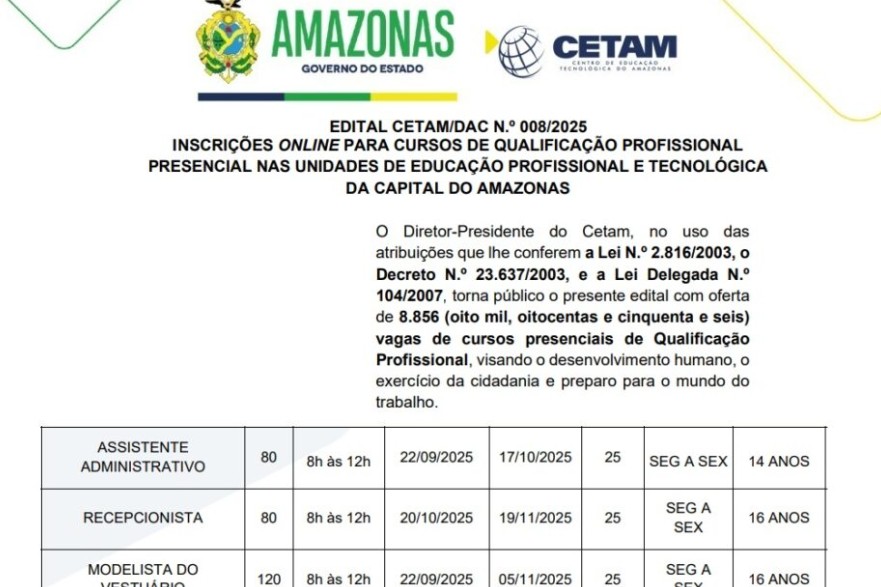 O Centro de Educação Tecnológica do Amazonas (CETAM) abriu mais uma grande oportunidade para quem deseja se capacitar e entrar no mercado de trabalho. O novo Edital Nº 008/2025 traz 8.856 vagas em cursos gratuitos de qualificação profissional, todos na modalidade presencial.