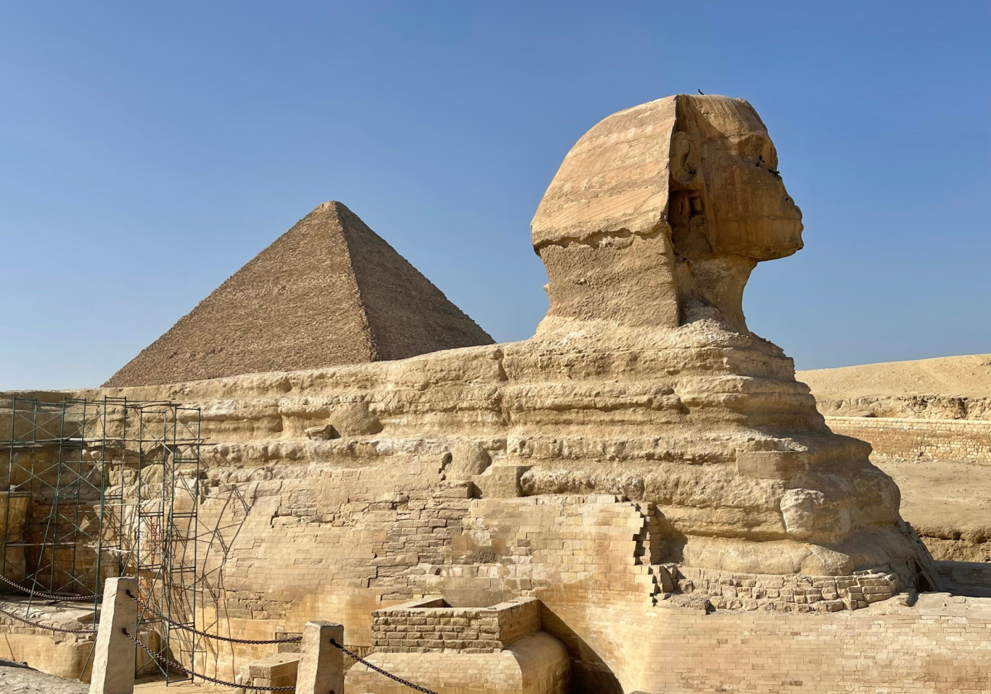 Platô de Gizé, um dos sítios mais famosos do Egito. Em primeiro plano, a Esfinge, ao fundo, a Grande Pirâmide – Imagem: CNN/reprodução