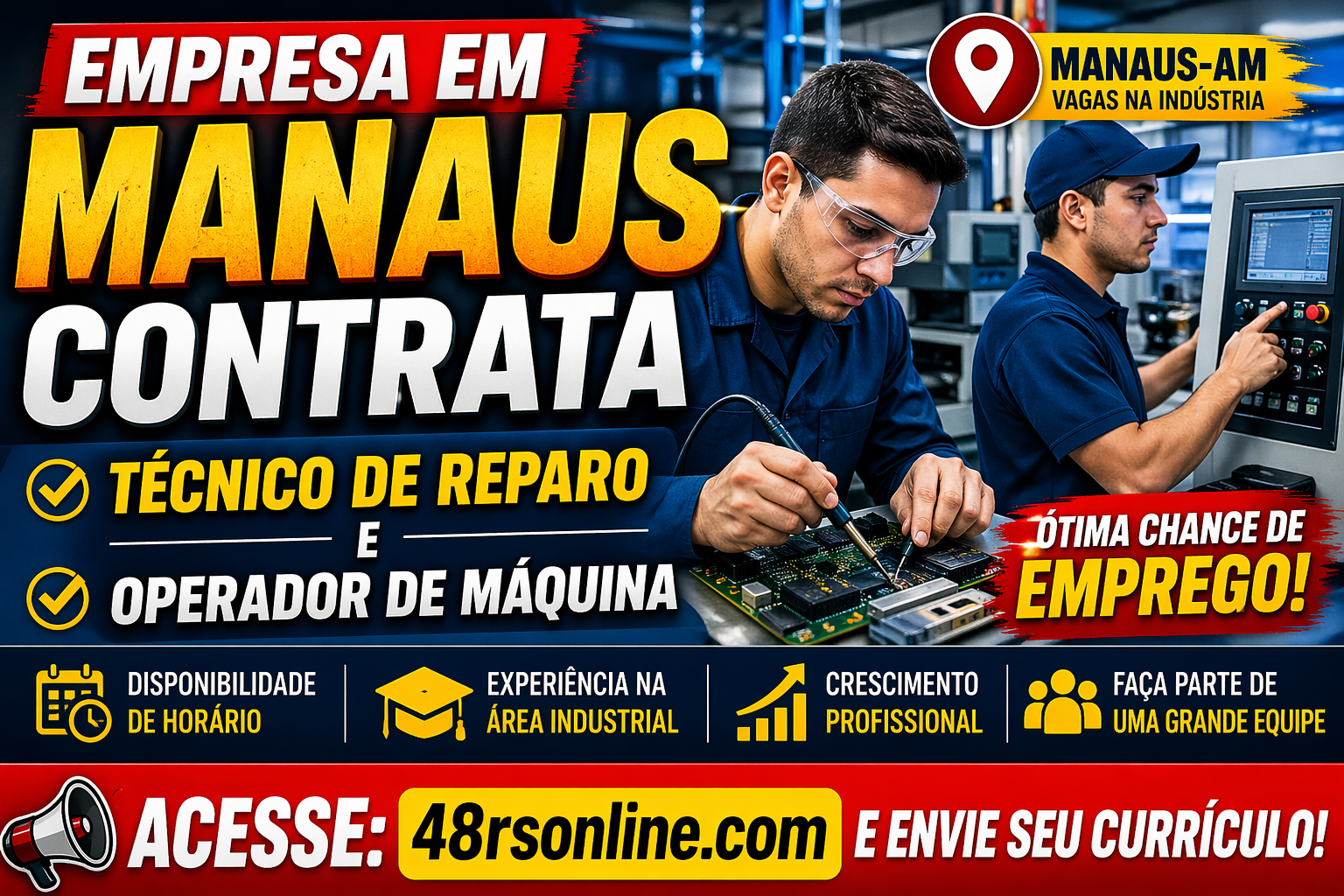 As vagas em Manaus continuam surgindo, principalmente no setor industrial. Dessa vez, uma empresa está contratando profissionais para duas funções importantes: Técnico de Reparo e Operador de Máquina SMT (FUJI). Essas oportunidades são voltadas para quem deseja crescer na área industrial e busca estabilidade.