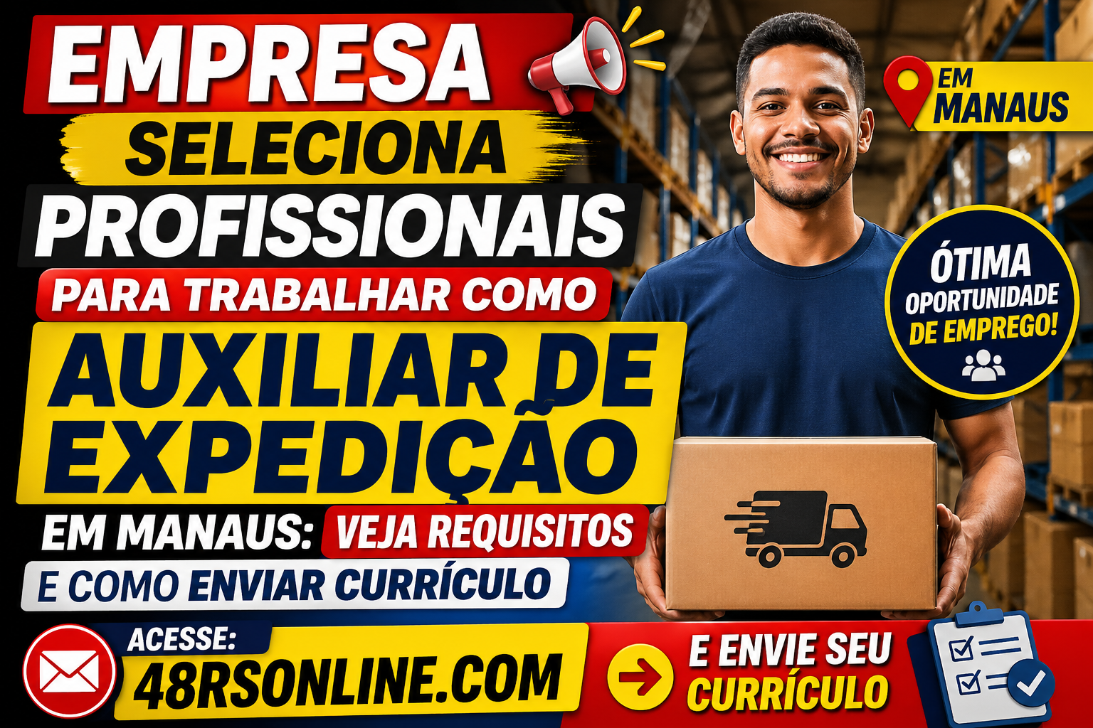 Uma empresa do ramo de logística está com processo seletivo aberto para contratar Auxiliar de Expedição em Manaus. A oportunidade pode ser ideal para quem deseja entrar ou crescer no mercado de trabalho, principalmente na área operacional, que segue contratando com frequência na capital amazonense.