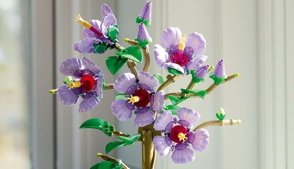 O destaque da temporada é o delicado kit de hibisco LEGO, com 660 peças que formam cinco flores vibrantes em tons de lavanda, com estames amarelos e botões em diferentes estágios de floração.