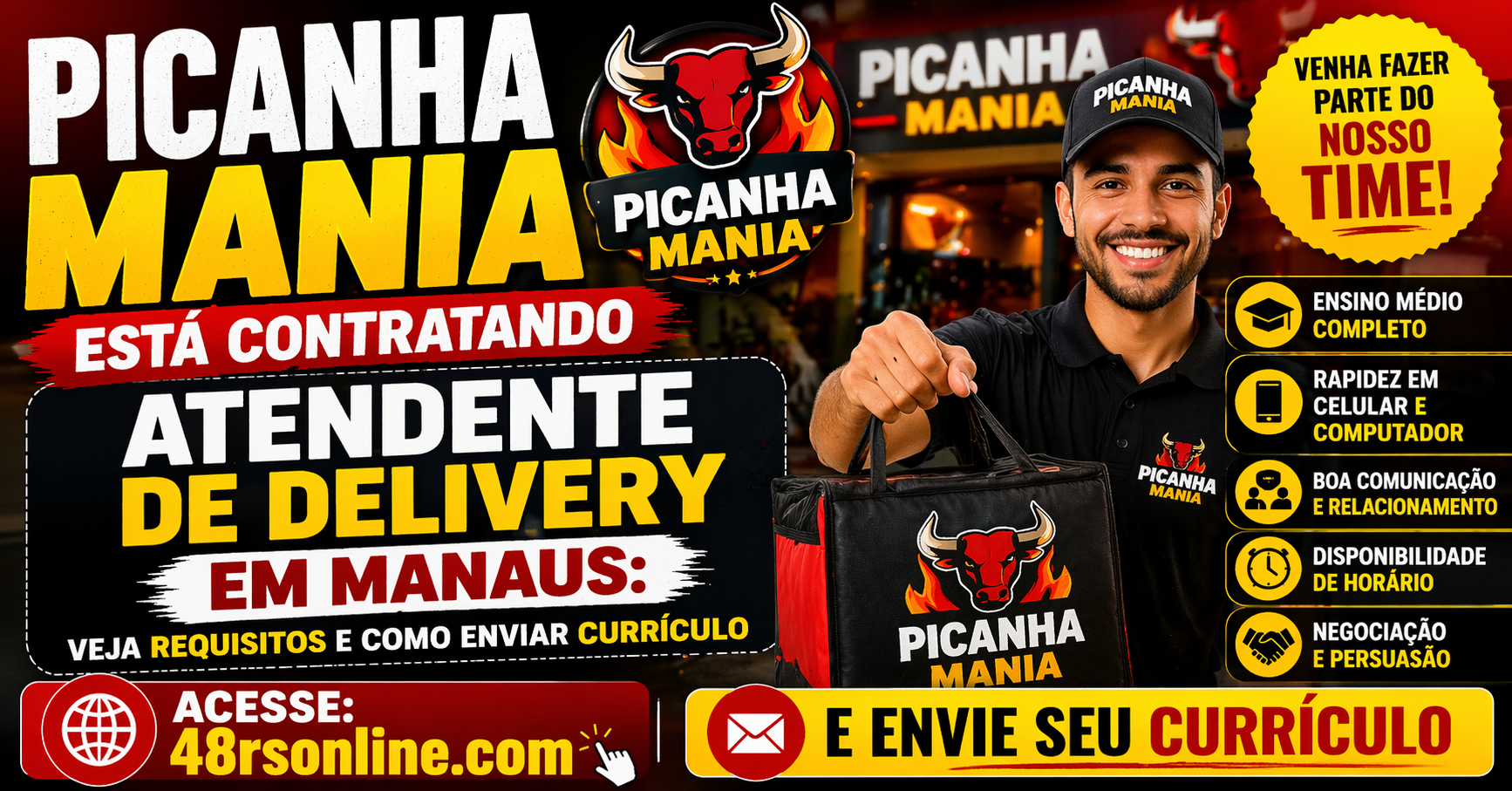 Quem está procurando vaga de emprego em Manaus pode encontrar uma boa oportunidade no setor de alimentação. O Picanha Mania está contratando Atendente de Delivery – Nível Médio, e a chance pode ser ideal para pessoas que desejam trabalhar com atendimento ao público, pedidos online e organização do setor.