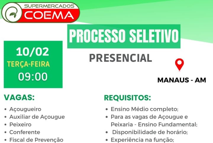 Processo seletivo presencial dos Supermercados Coema acontece em Manaus com vagas para açougue, loja, padaria, transporte e mais. Saiba quem pode participar, como se preparar e onde comparecer.